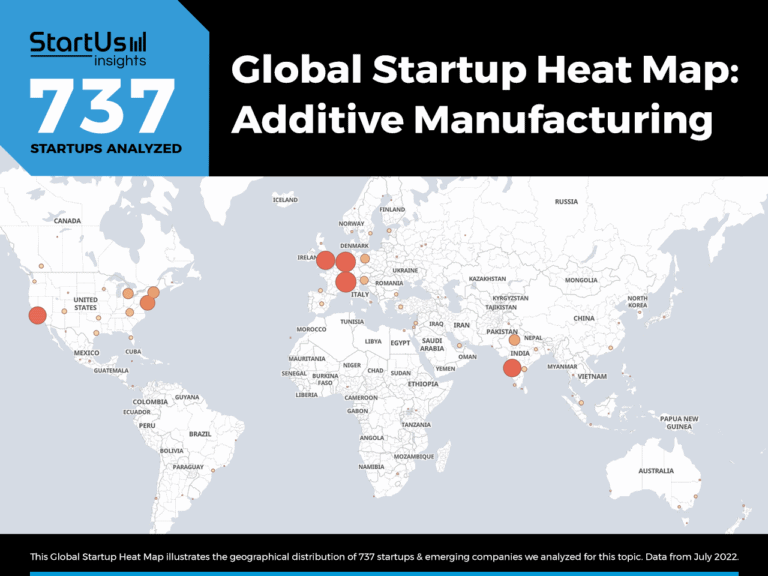 The Global Startup Heat Map below highlights the global distribution of the 737 exemplary startups & scaleups that we analyzed for this research. Created through the StartUs Insights Discovery Platform, the Heat Map reveals that Western Europe has a high concentration of additive manufacturing startups, followed by the US and India.